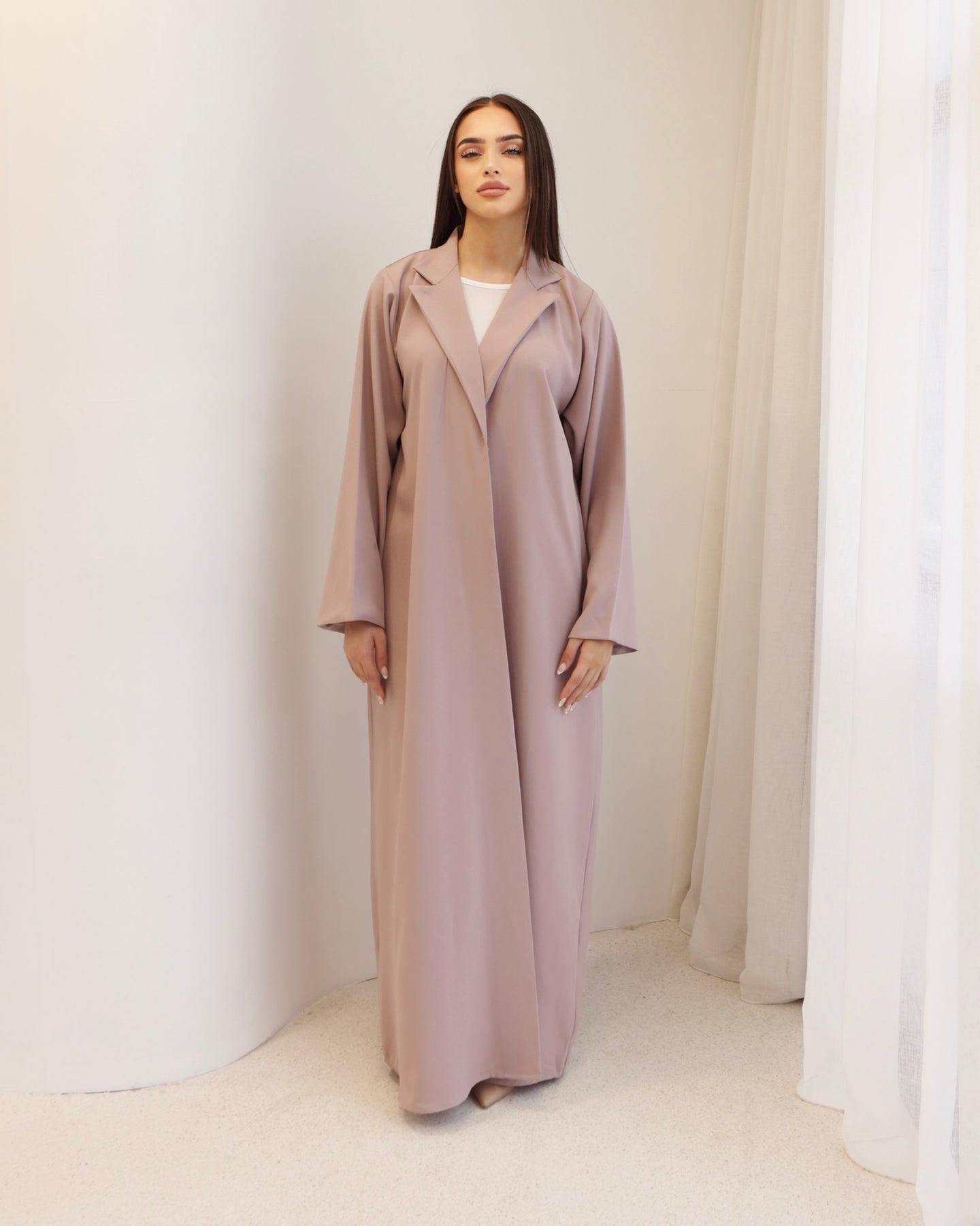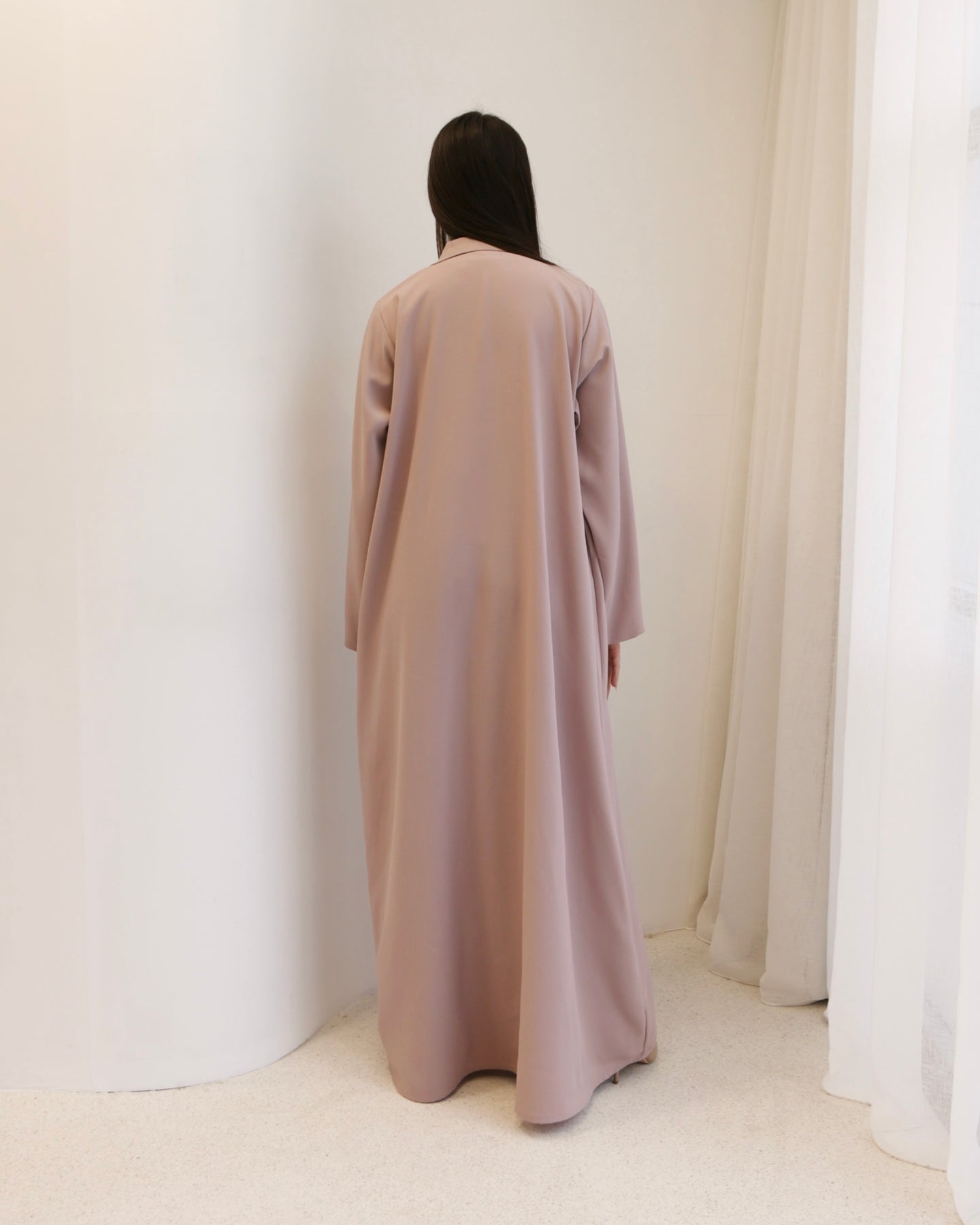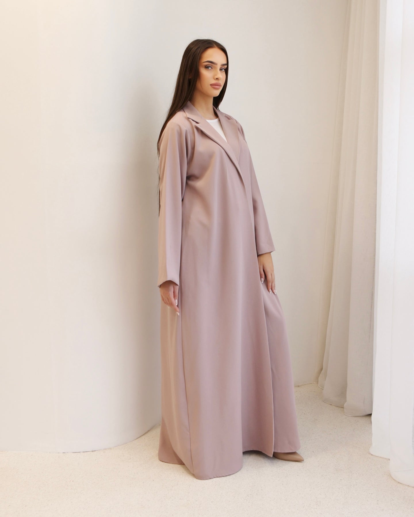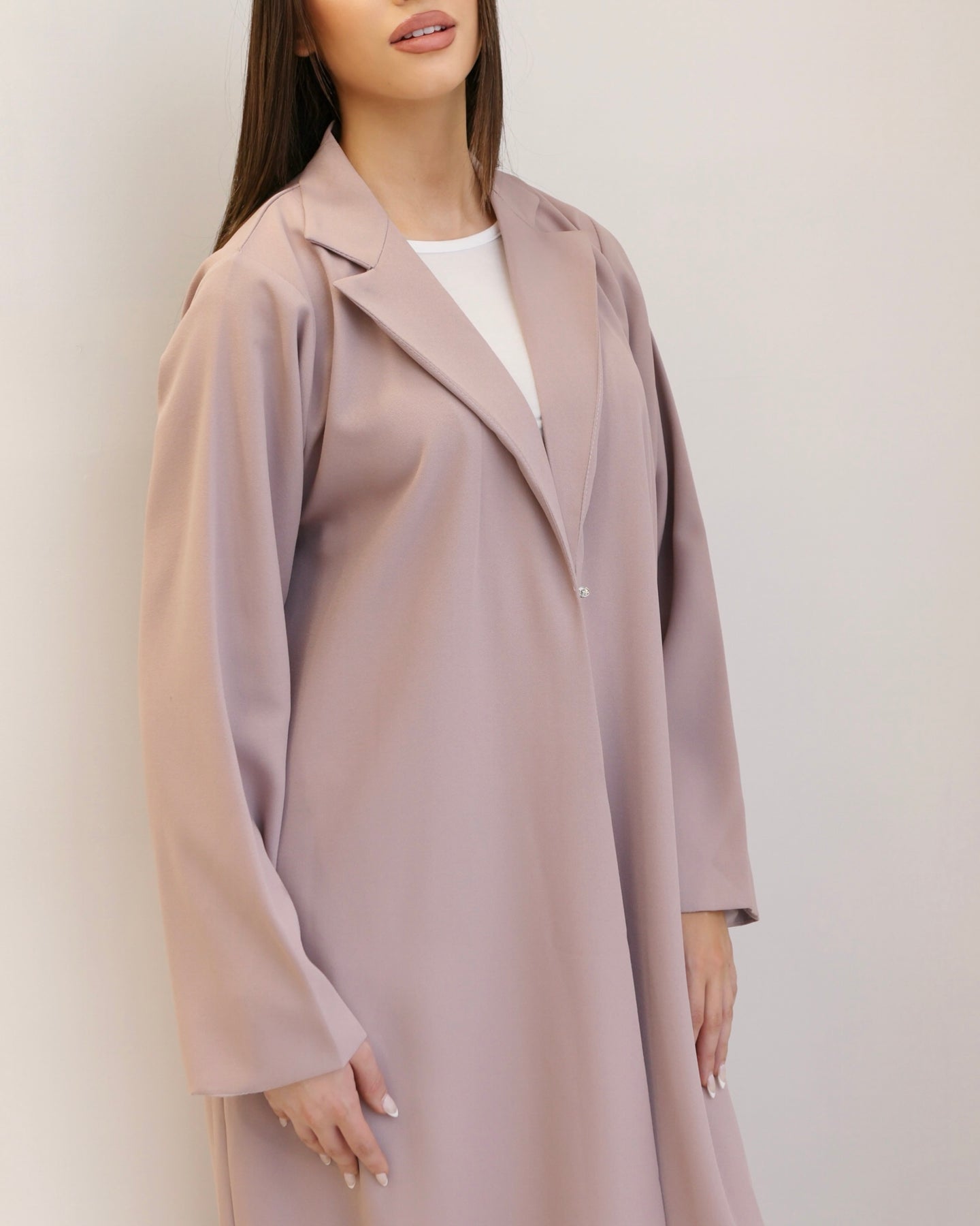 A soft dusty- lilac blazer- style abaya tailored with clean and subtle structure. Its minimal, refined design makes it a timeless piece for effortless, modern elegance